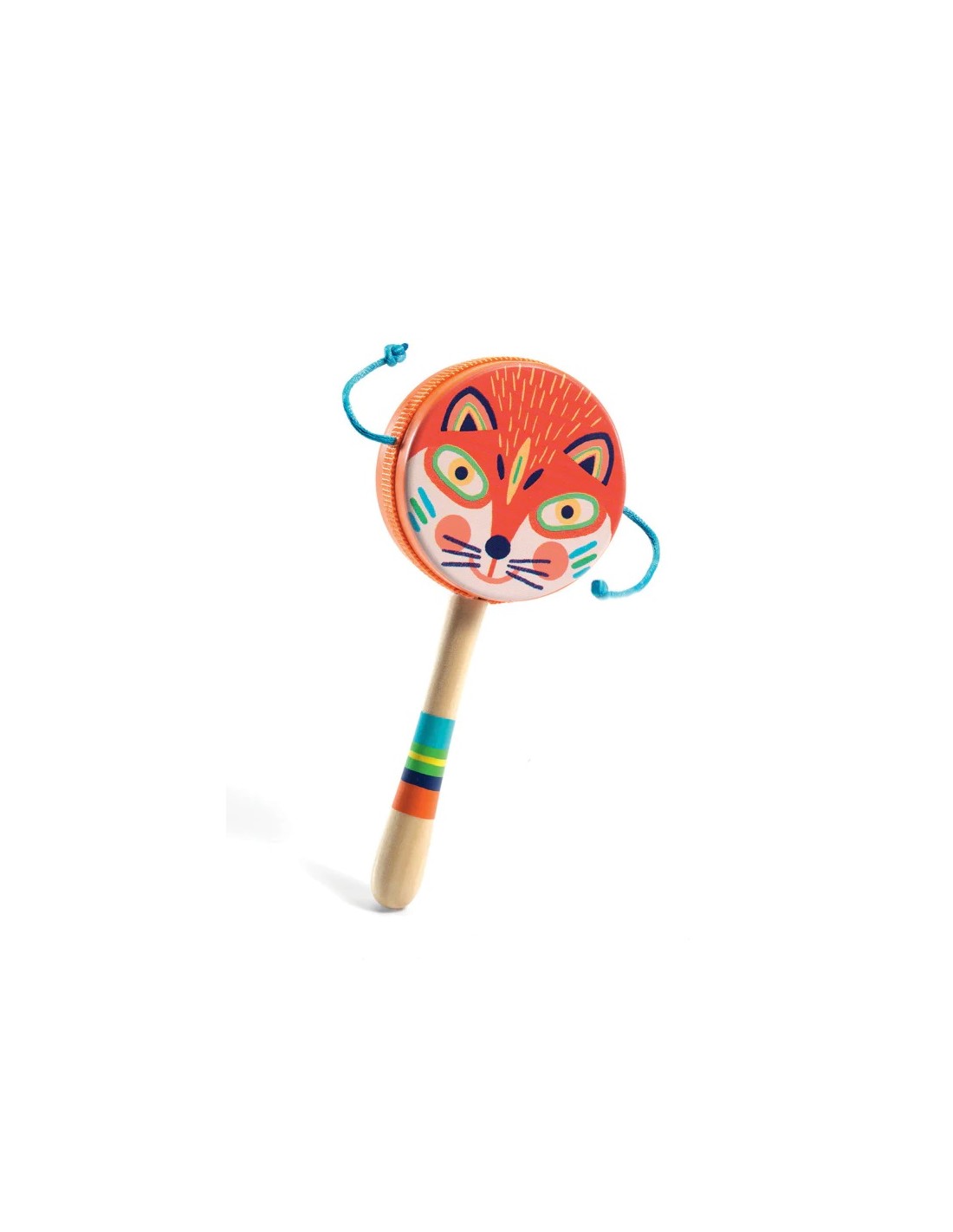 ¡El adorable tambor con mango presenta una cara salvaje y colores brillantes que les encantarán a los niños!